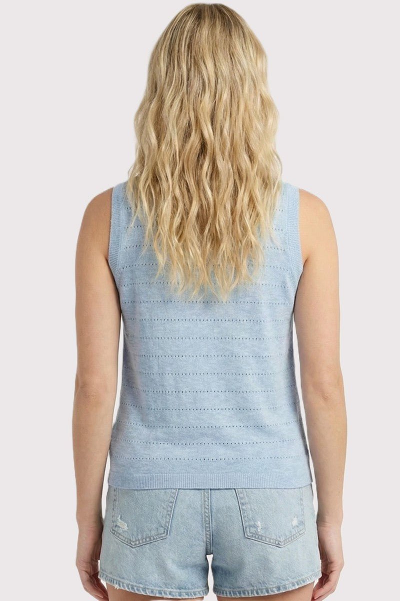 Elevate your warm-weather wardrobe with this chambray pointelle sweater tank. Crafted from soft, breathable chambray knit fabric with delicate pointelle detailing, this lightweight sleeveless sweater tank offers a subtle texture and airy feel, perfect for layering or wearing on its own. The relaxed fit keeps it comfortable while maintaining a polished look, making it ideal for casual outings, errands, or weekend brunch. Pair it with denim, shorts, or skirts for a versatile, stylish spring and summer layering piece that blends comfort with effortless sophistication.
