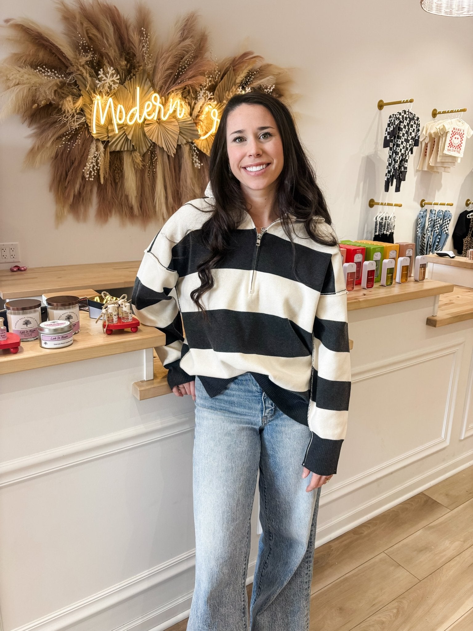Meet the charcoal striped reverse stitch sweater you’ll be reaching for on repeat. Designed with a flattering half-zip closure, elevated collared neckline, and trendy exposed reverse stitching, this oversized sweater delivers effortless comfort with a polished edge. The added side slits create easy movement and a relaxed fit, making it perfect for styling with denim, leggings, or layered looks. Whether you’re dressing it up or keeping it casual, this versatile charcoal sweater is a must-have for everyday wear—shop now and upgrade your cozy wardrobe.