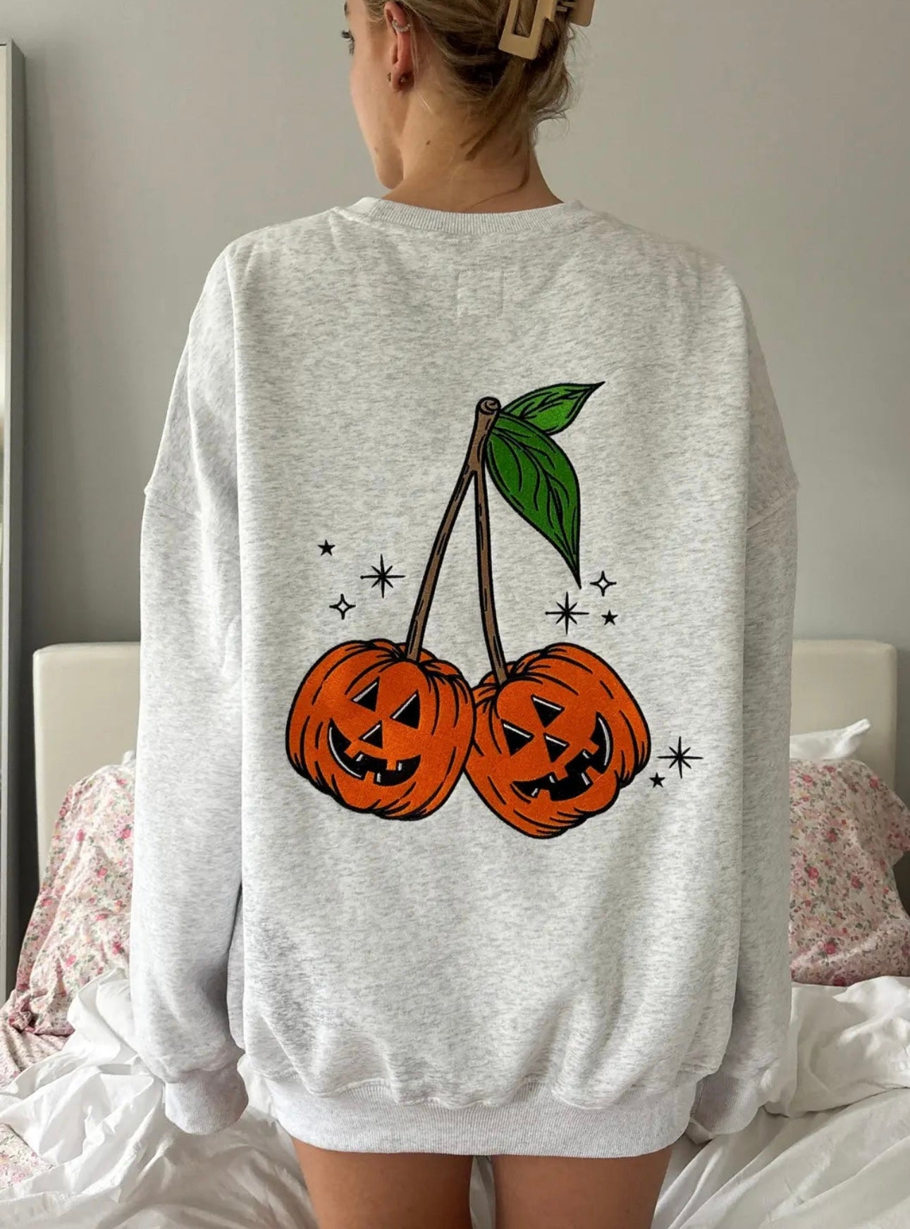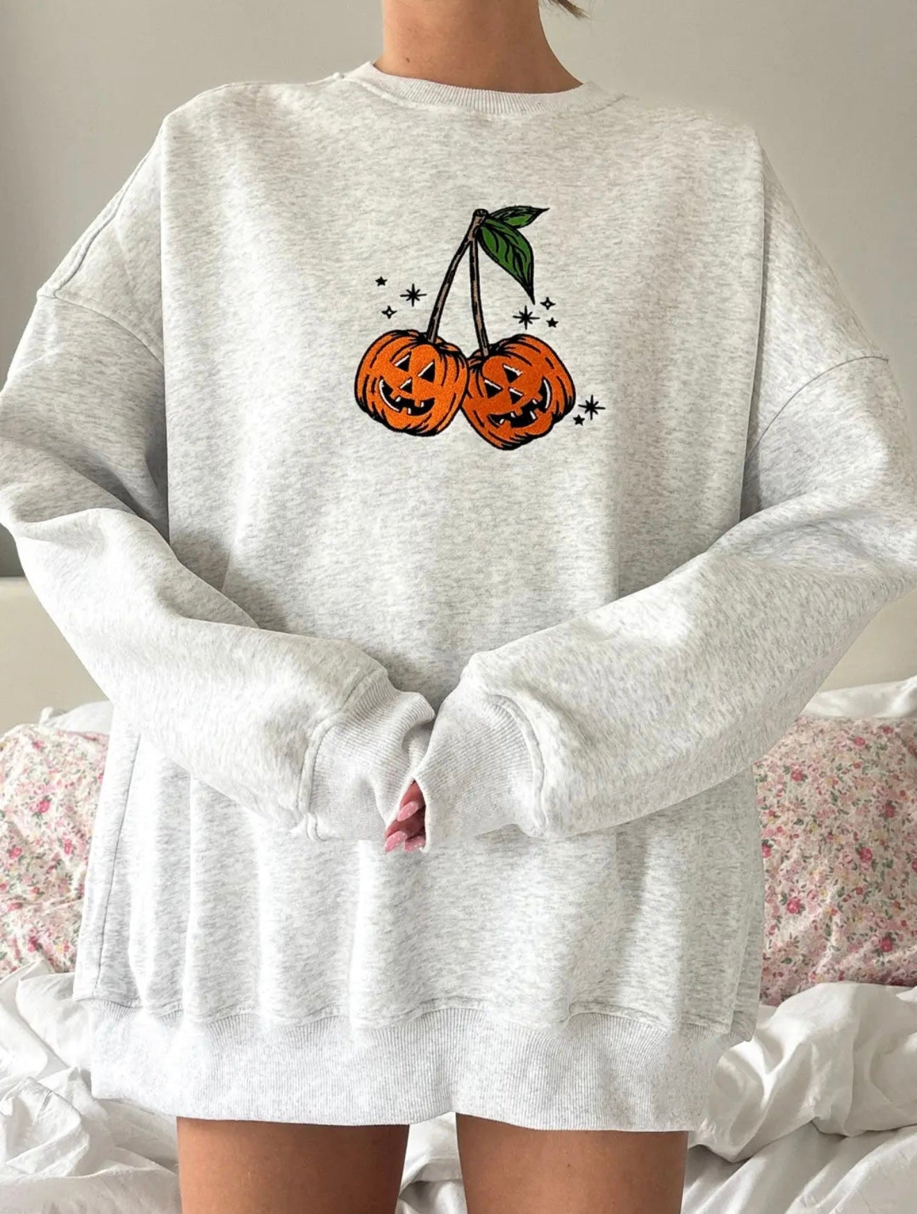 Celebrate fall in style with this embroidered pumpkin cherries sweatshirt, featuring an adorably festive design perfect for Halloween. Made from soft, cozy fabric, this pullover sweatshirt is a must-have seasonal staple for layering or lounging. The relaxed fit and playful embroidery make it a fun way to add charm to your autumn wardrobe. Pair it with jeans or leggings for a cute, casual look that’s perfect for pumpkin patches, trick-or-treating, or cozy nights in.